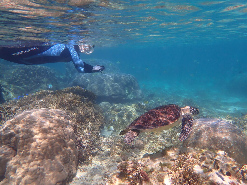 すると、今日の海はお二人を大歓迎してくれました! なんと、立派なウミガメが2匹も姿を現してくれたんです。 「いた!」「2匹も!」と水中で大興奮されている様子を見て、私も心の中でガッツポーズ。25歳の若さ溢れるお二人が、子供のように目を輝かせて海を覗き込む姿がとても印象的でした。