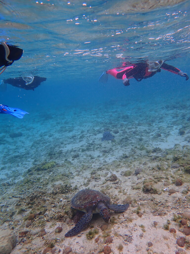 今回のお客様の一番の目的は、やっぱりウミガメさんに会うこと。 期待に応えるべく、僕もしっかりとエスコートさせていただきました。 そして無事に、ゆったりと泳ぐウミガメさんに遭遇!念願の姿を間近で見ることができて、皆さん本当に嬉しそうでした。