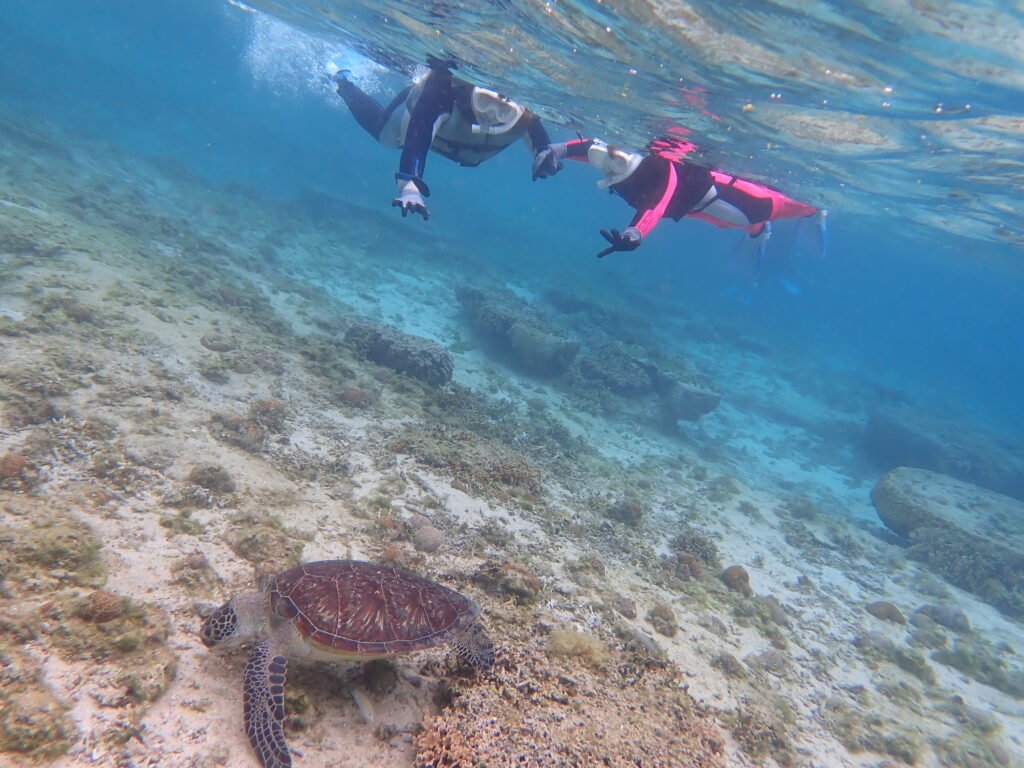 浜辺に到着した時から、みんなの笑い声が絶えなくて、僕まで学生時代に戻ったような楽しい気分にさせてもらいました。 海の中に入ると、透明度もバツグン!皆さんがずっと楽しみにしていたウミガメさんにも、無事に出会うことができました。