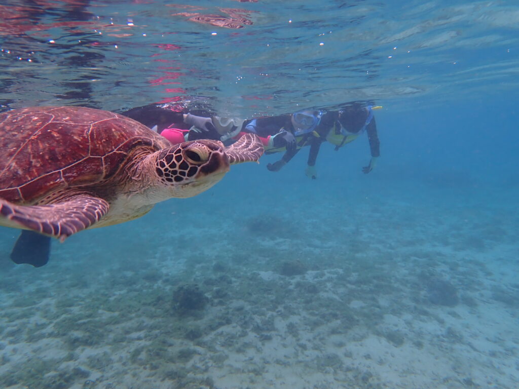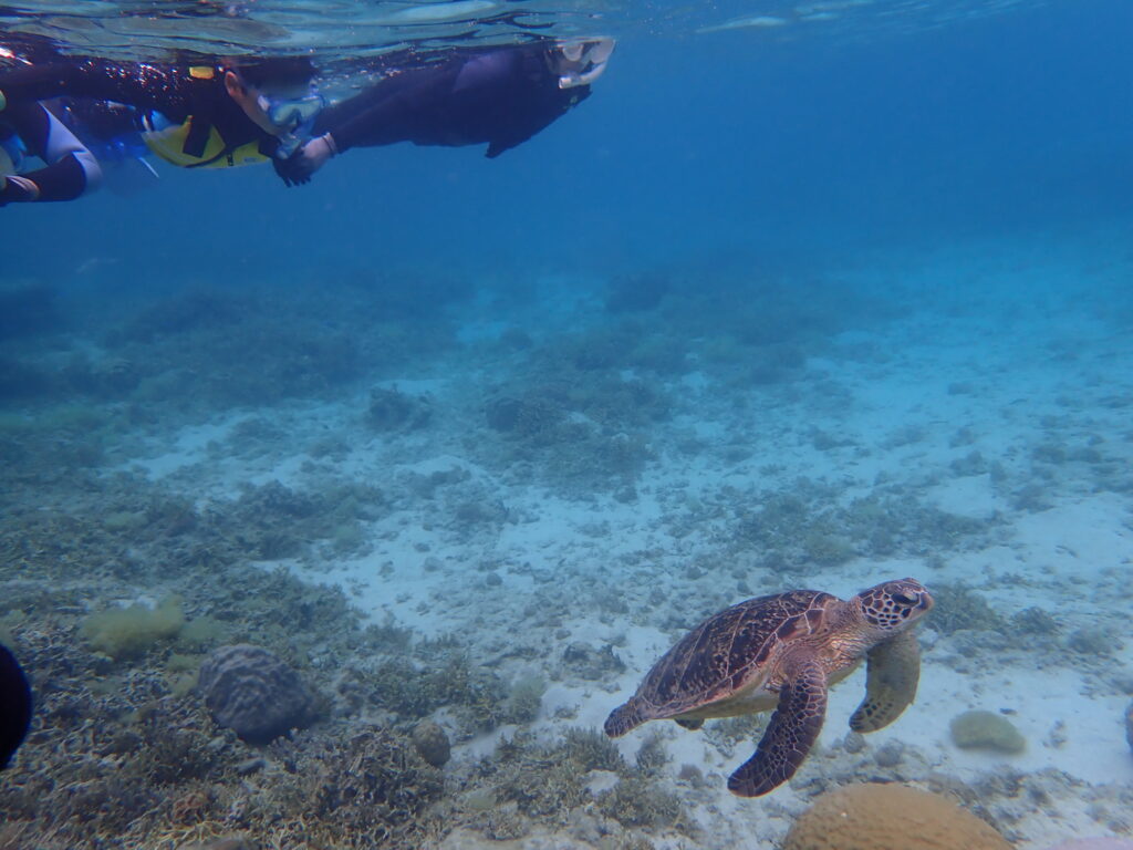 そして海の中へ。 少し泳いだところで、ついに念願の瞬間がやってきました。 今日出会えたのは、2匹のかぁーみぐわぁー(ウミガメさん)!