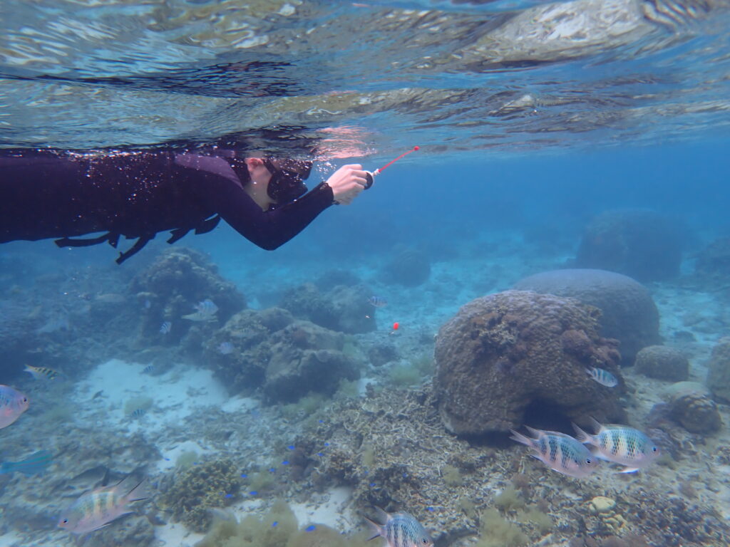 今日のプランは、シュノーケリングとフィッシングの両方を楽しめるコース! 「天然水族感」と言われるこの海では、お魚を見ながら釣るという体験ができるんです。