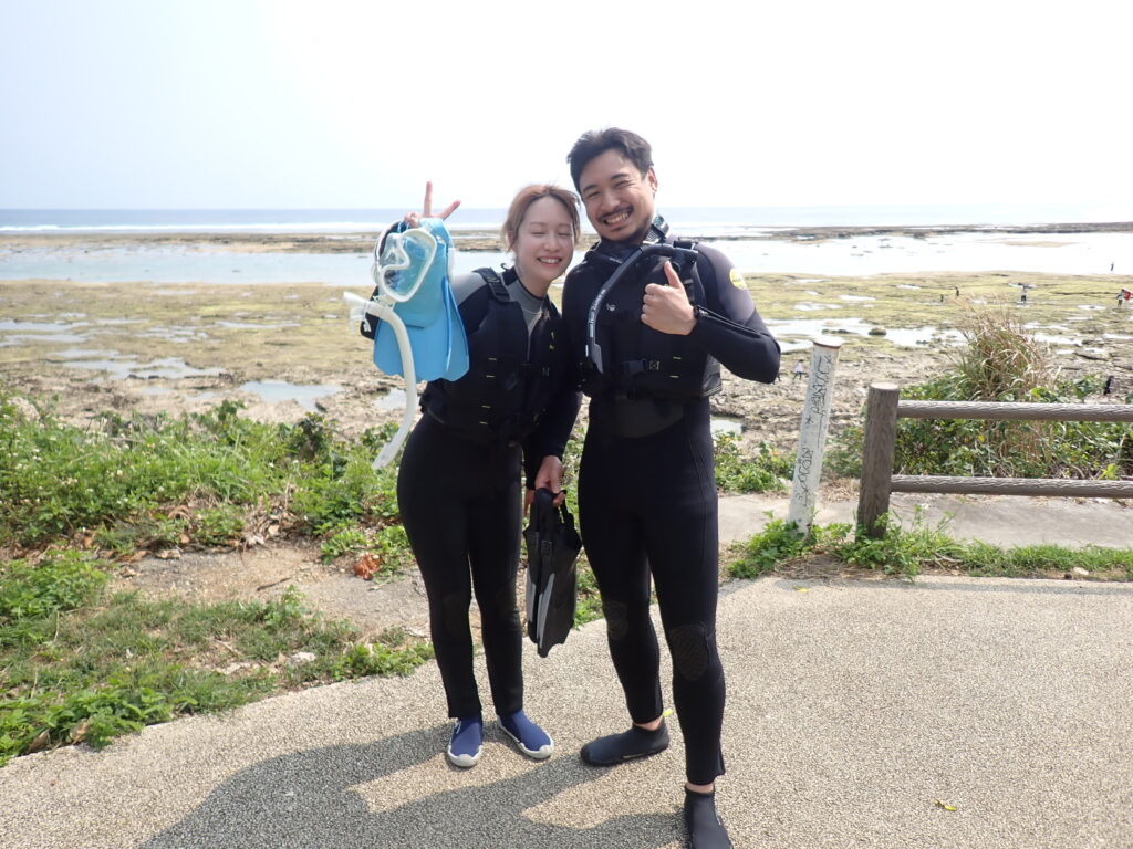 今日は気持ちいい晴天! 沖では台風のうねりが出始めていましたが、ジョン万ビーチには最強の「天然の防波堤」があります。リーフが波をしっかりガードしてくれる干潮時間を狙って、ベタ凪の海で遊んできました。
