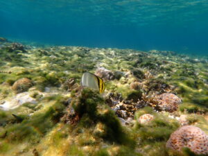 今日はまさに絶好のシュノーケリング日和。 気温が19度で太陽さんさんまでなると、海から上がった後の風も心地よく、冬であることを忘れてしまうほどです。しかも、1月・2月の海は夏場に比べて透明度が格段に高く、水面に浮かんでいるだけで水底のサンゴや魚たちがくっきりと見渡せます。